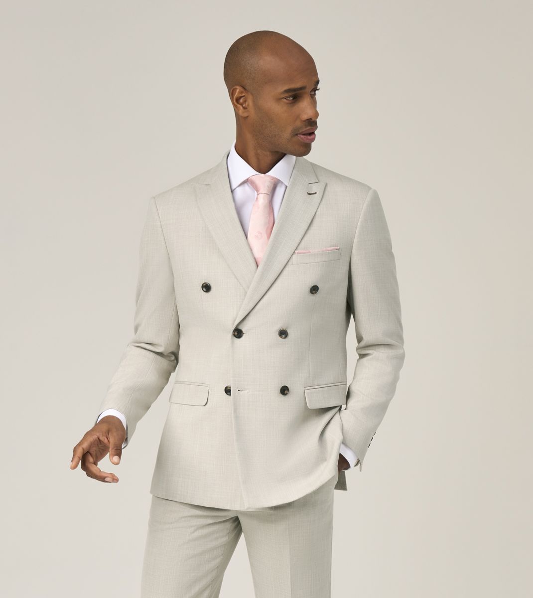 The Redding is a Double Breasted suit in a silhouette-defining Tailored Fit. With my stone semi-plain cloth, pull-out pocket hankie and horn-effect buttons, I vow to make you look your best. I’m the perfect match for summer weddings and other seasonal soirées. Redding suit jacket in stone fabric with stretch.