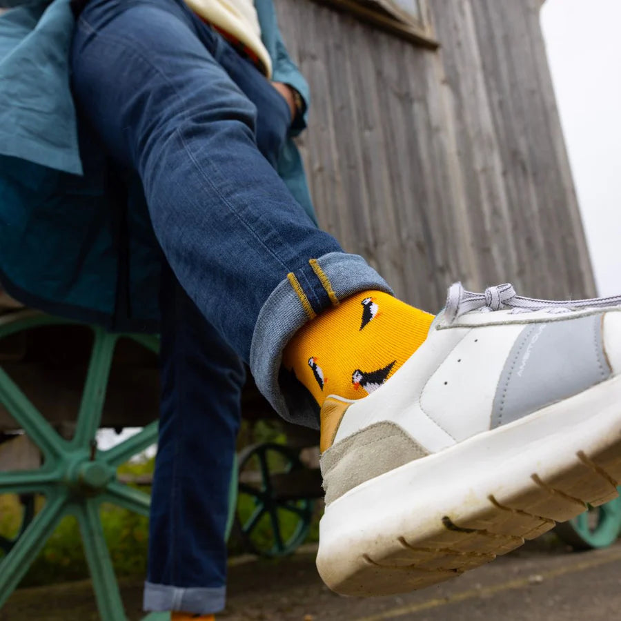 The design of these bamboo socks features a charming image of a puffin bird, set against a yellow background. The puffin graphics are detailed and delightful, making them stand out and catch the eye.